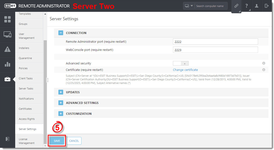 After completing the steps in section I and section II, you are ready to change the server certificate to the correct one for your new server, Server Two in this example. To do so, follow the steps below:
