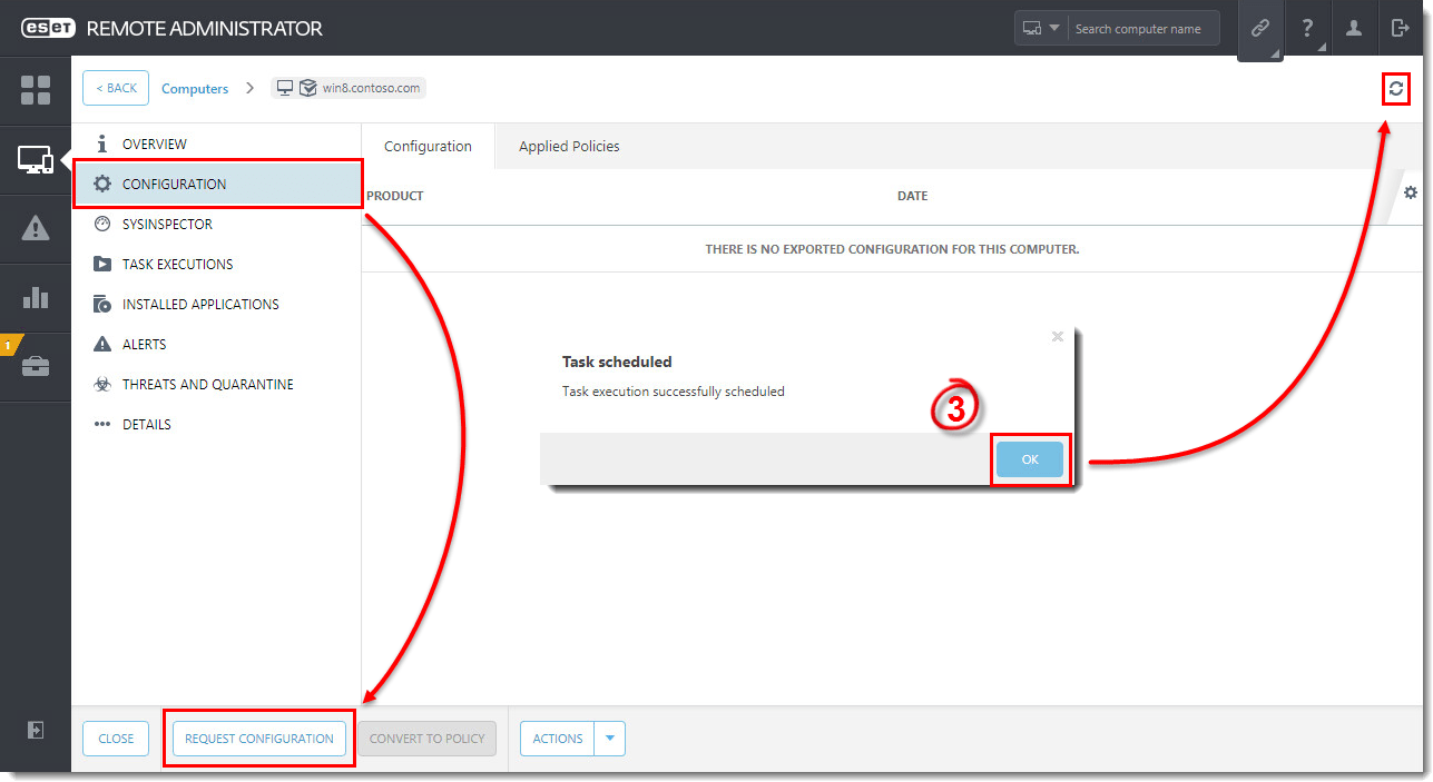 - Click Configuration → Request Configuration. Click OK when the Task scheduled notification is displayed. Click Refresh to see the configurations from the client when they are downloaded.