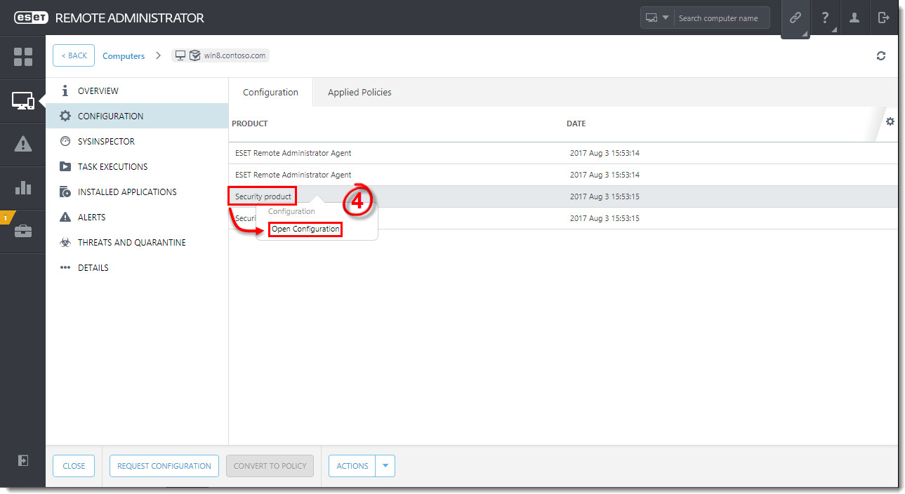 - Select the configuration you want to use in a new policy and click Open Configuration. To use the configuration settings from ESET Endpoint Security or ESET Endpoint Antivirus, select Security product.