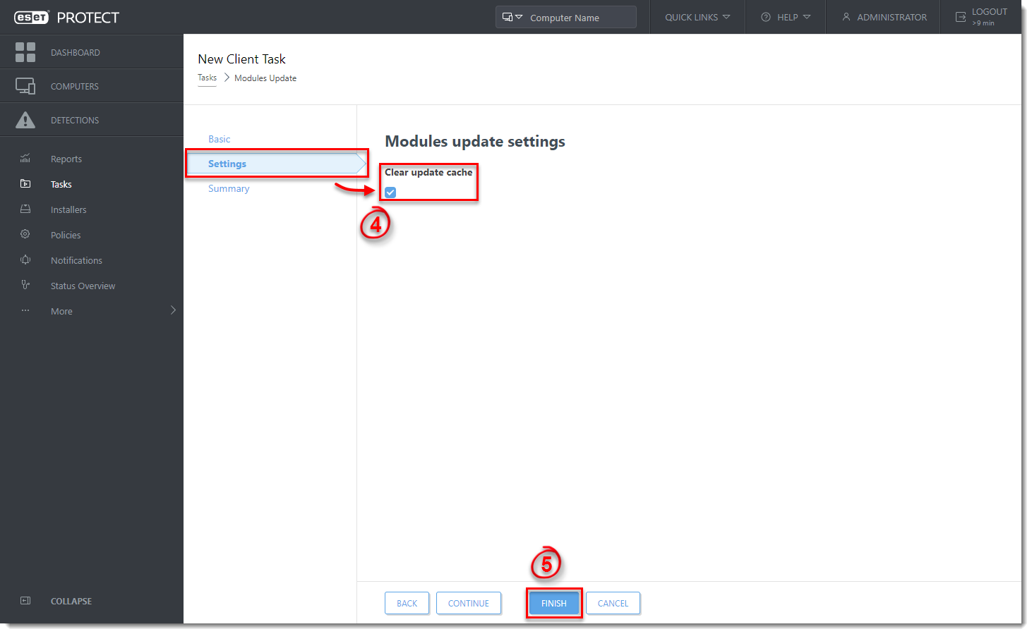 - Click Settings and select the check box under Clear update cache. You will add Targets after the task is created.