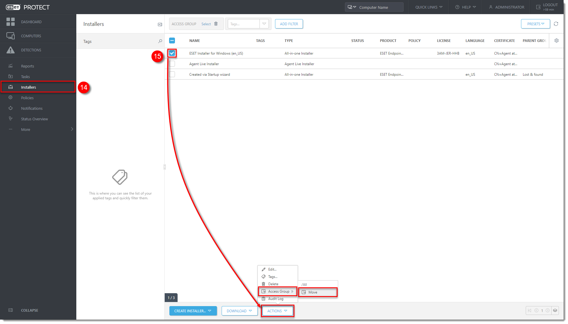 - Select the new installer. Click Actions → Access Group → Move.