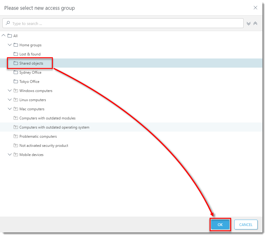 Click the image to view larger in new window - Select the destination group (Shared objects) and click OK. The policy will be moved to the shared group and all users with the appropriate permissions set (Shared_ps) will be able to use it on computers/devices.