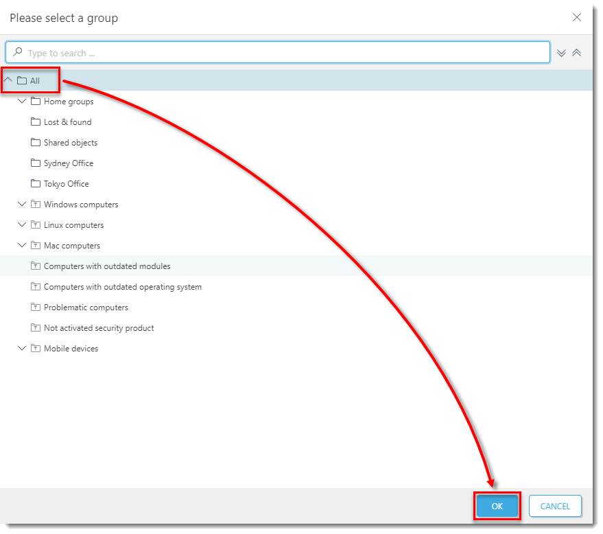 Click the image to view larger in new window - In the new window select the group which is shared in the branch and click OK. The task will be moved to the shared group for the branch, allowing all branch administrators to use it.