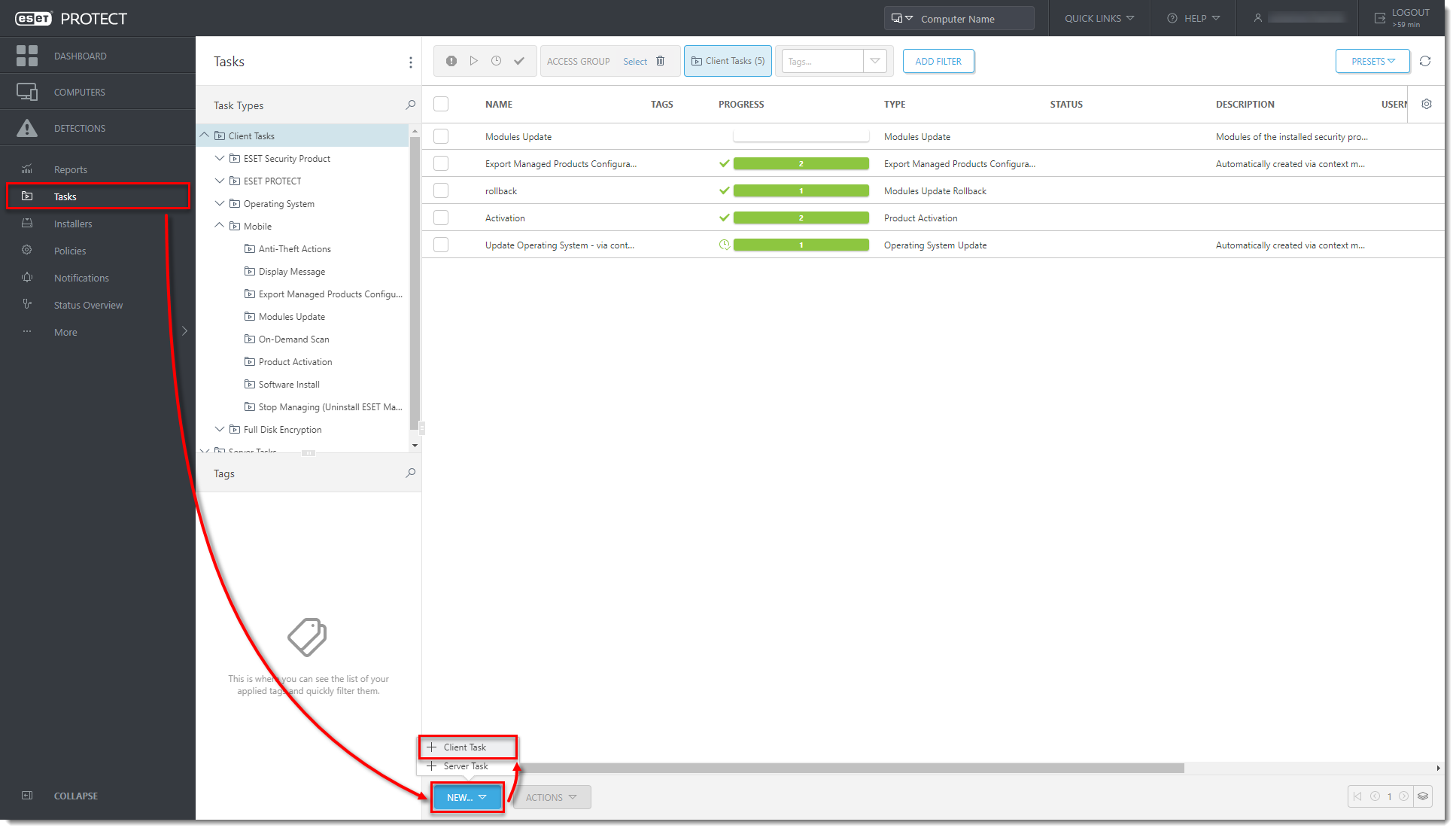 - Click Tasks → New → Client Task.